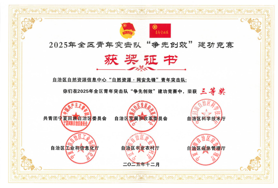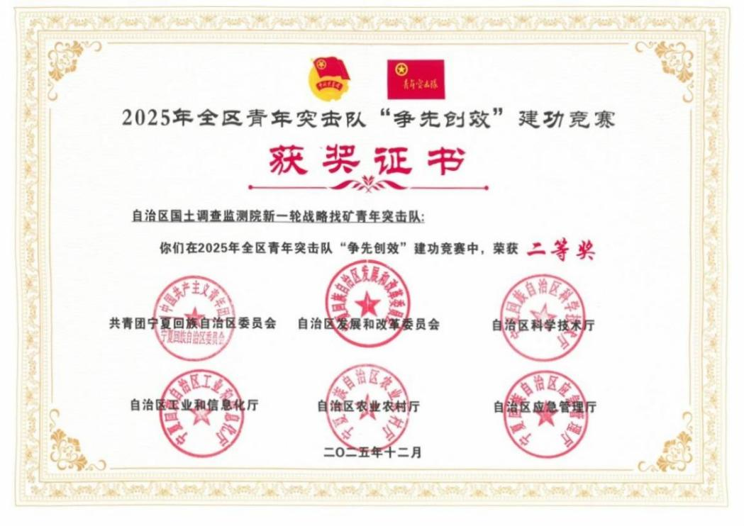 近日,由自治区团委、发展改革委等多部门联合举办的2025年度全区青年突击队“争先创效”建功竞赛结果正式揭晓,宁夏自然资源厅两支青年突击队斩获佳绩。其中,自治区国土调查监测院新一轮战略找矿青年突击队获二等奖,宁夏自然资源信息中心“自然资源·网安先锋”青年突击队获三等奖,双线发力彰显了自然资源领域青年团队的专业素养与攻坚本色。